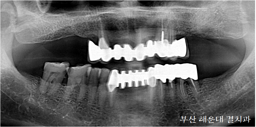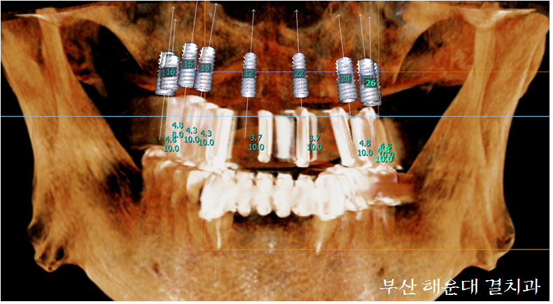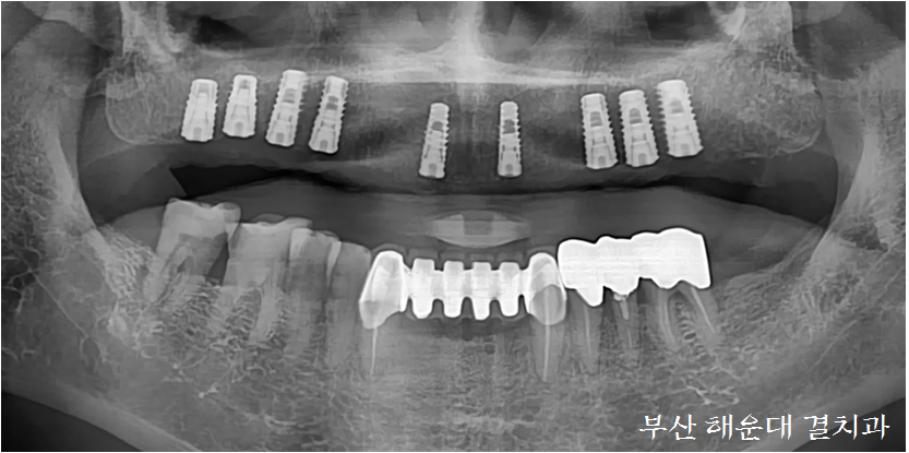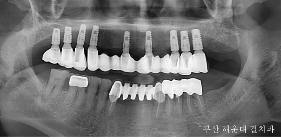 상담후 9개의 임플란트를 식립하고 고정성 보철물(틀니와 다르게 입안에 고정되어있는 보철)로 진행하기로 하였습니다.