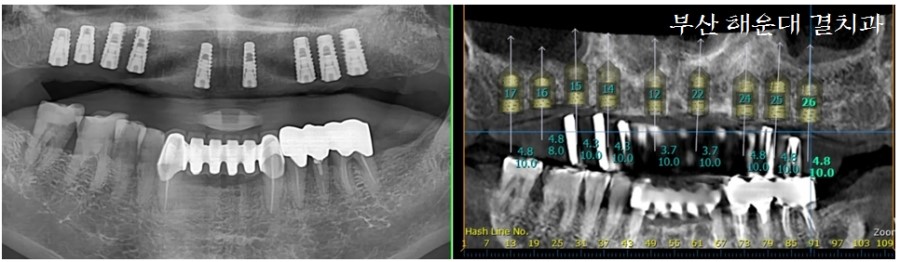 식립 후 사진(좌)과 CT분석(우)에서의 사진을 비교해 보면 거의 동일한 위치에 임플란트가 정확히 식립되어 있는것을 볼 수 있습니다. 해운대 결치과는 대학병원에서 임플란트 수술을 전문으로 많은 수술경험을 갖고 있기 때문에 안심하고 수술을 받으시면 됩니다!